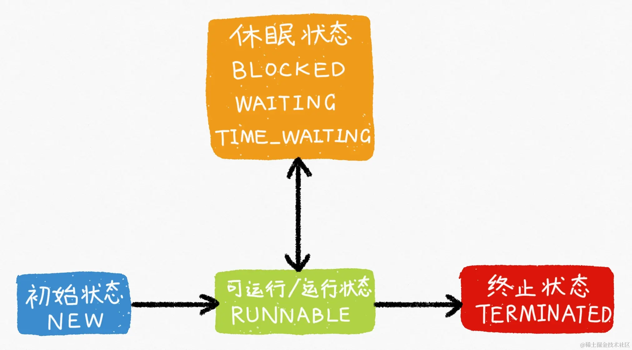 Java刚创建出来的Thread thread对象就是NEW状态,调用了thread.start()方法后,线程就进入了RUNNABLE状态。