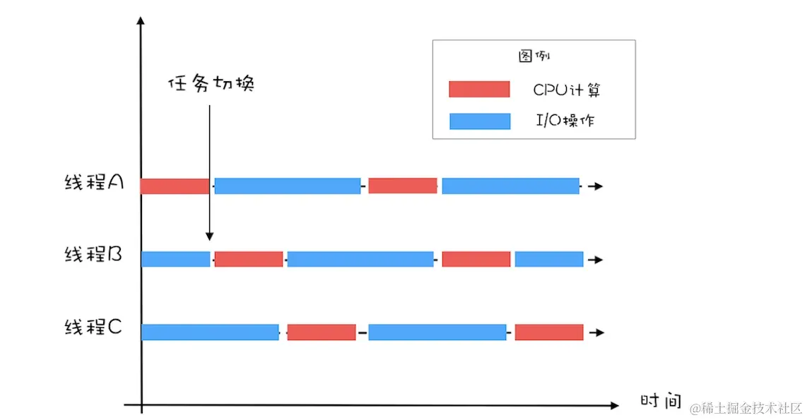 - 理想情况下,CPU在线程A、B、C之间按如下方式切换,理论上实现100%的CPU利用率。