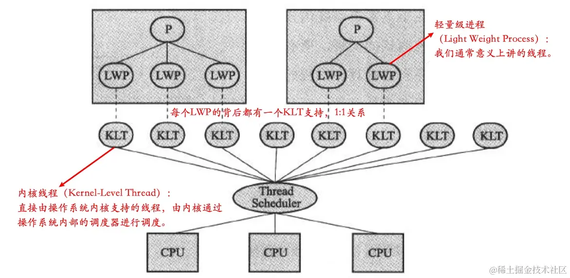 内核线程(KLT),就是直接由操作系统支持的线程,不过当然不是我们的程序可以直接去操作系统的进程,而是程序可以通过调用内核线程的一种高级接口——轻量级进程(LWP),来操作内核进程。也就是说,LWP和KLT之间是1:1的关系,因此我们也称这种模型为一对一的线程模型。