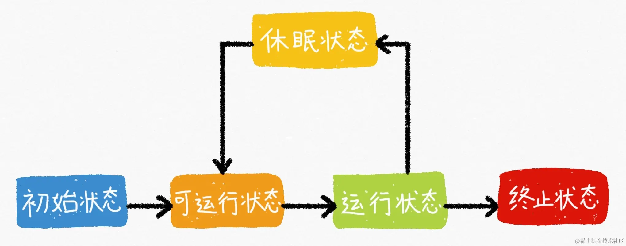 - 运行状态的线程如果调用了某个阻塞式API(如以阻塞方式读文件),那么这个线程将变为休眠模式,并放弃自己的CPU使用权;
