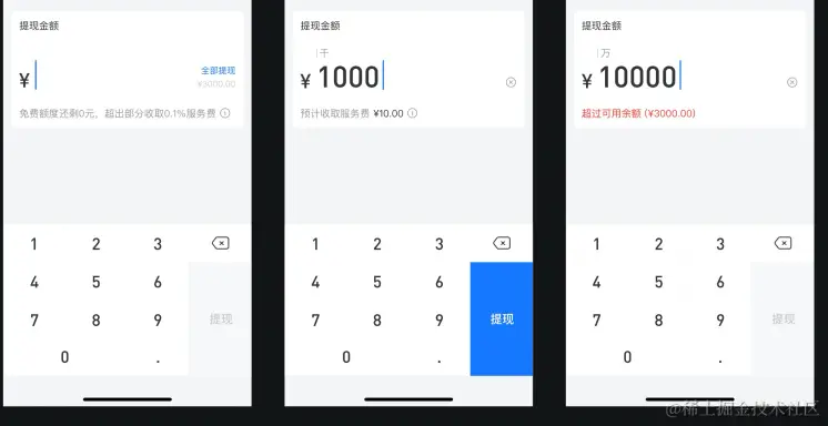 - 自研数字键盘,能正常输入数字,点击退格键可以删除对应的数字。聚焦提现时唤起,失焦时隐藏。