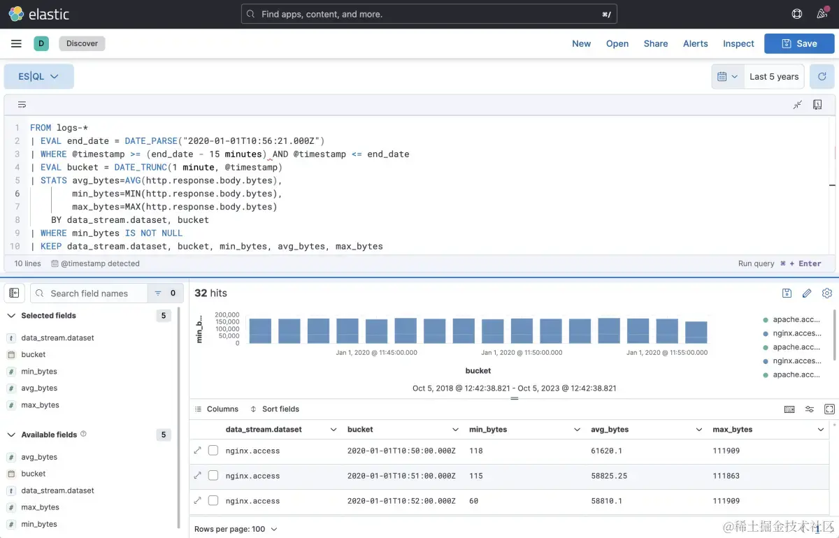 - 利用卓越的查询用户体验:ES|QL查询表达式支持复杂的分析和数据处理,易于学习、阅读和共享。