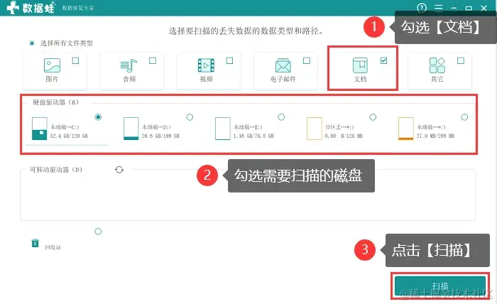 步骤2:需要恢复WPS文件,只需勾选上【文档】, 并勾选WPS文件常保存的磁盘,点击 【扫描】;