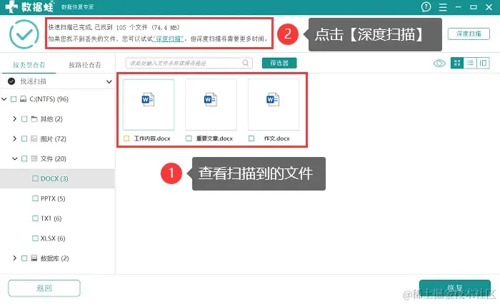 步骤3:软件会对所选磁盘进行快速扫描,用户可以根据扫描到的数据查看是否有需要恢复的WPS文件,若只扫描到小部分文件,建议点击【深度扫描】;