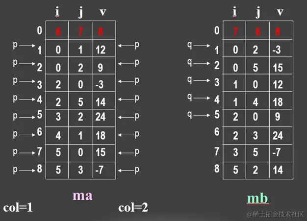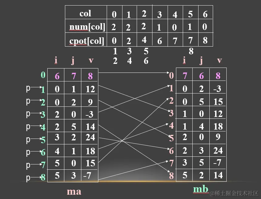 即按mb中三元组次序依次在ma中找到相应的三元组进行转置。为找到M中每一列所有非零元素,需对其三元组表ma从第一行起扫描一遍。由于ma中以M行序为主序,所以由此得到的恰是mb中应有的顺序。