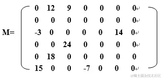 例如:下列三元组表: ( (0,1,12), (0,2,9), (2,0,-3), (2,5,14), (3,2,24), (4,1,18), (5,0,15), (5,3,-7) ),加上(6,7,8) ——矩阵的行数、列数及非零元数便可作为矩阵M的另一种描述: