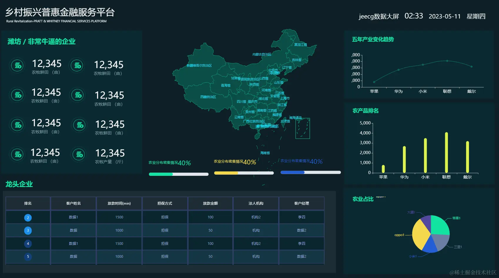 - 大屏设计器支持几十种图表样式,可自由拼接、组合,设计炫酷大屏