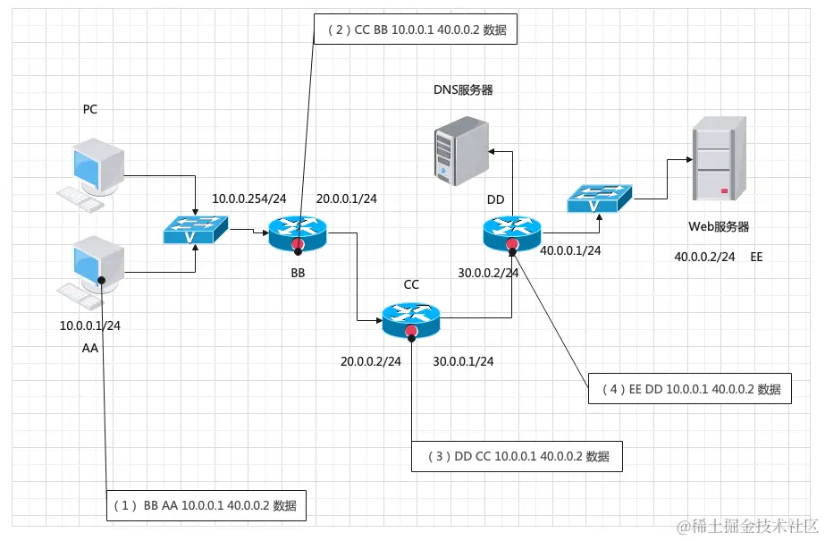 2、核心部分:由大量网络和连接这些网络的路由器组成。这部分是为边缘部分(提供连通性和交换)
