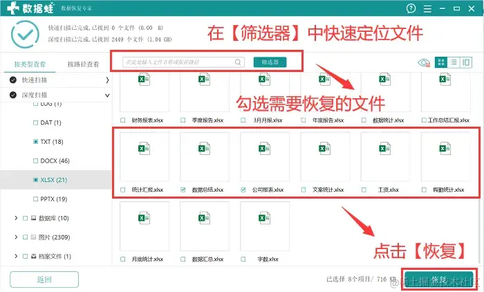 4.深度扫描完成后,可以点击【筛选器】 ,输入相关的条件,对文件进行快速的筛选,完成所有选择后,点击【恢复】,并为恢复后的文件选择另一个保存位置。