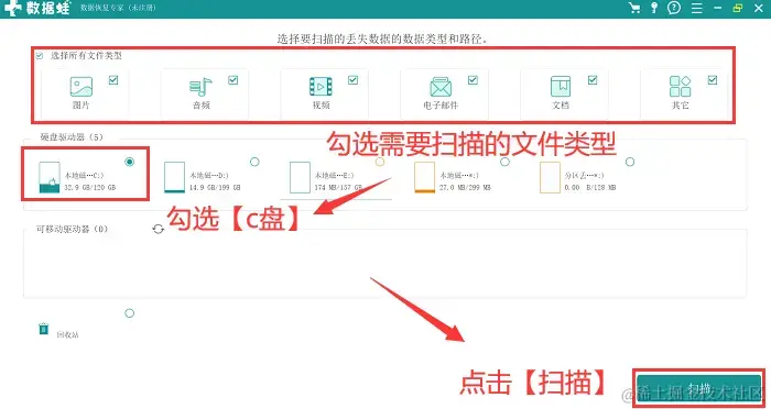 2.勾选想要扫描的文件类型,再勾选上 【c盘】 (桌面文件一般会默认保存在c盘),然后点击 【扫描】;