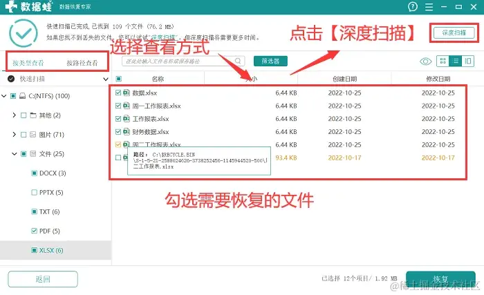 3.扫描完成后,可以点击【按路径查看】或 【按类型查看】,选择合适的查看方式,然后在右侧对文件进行勾选,如果在此次扫描中没有扫描到相应的文件,点击【深度扫描】 ;