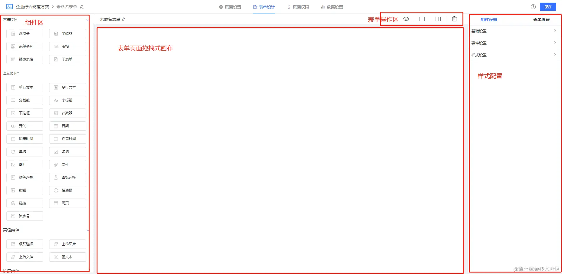 设计器包括:组件区、画布区、样式属性配置区、表单操作