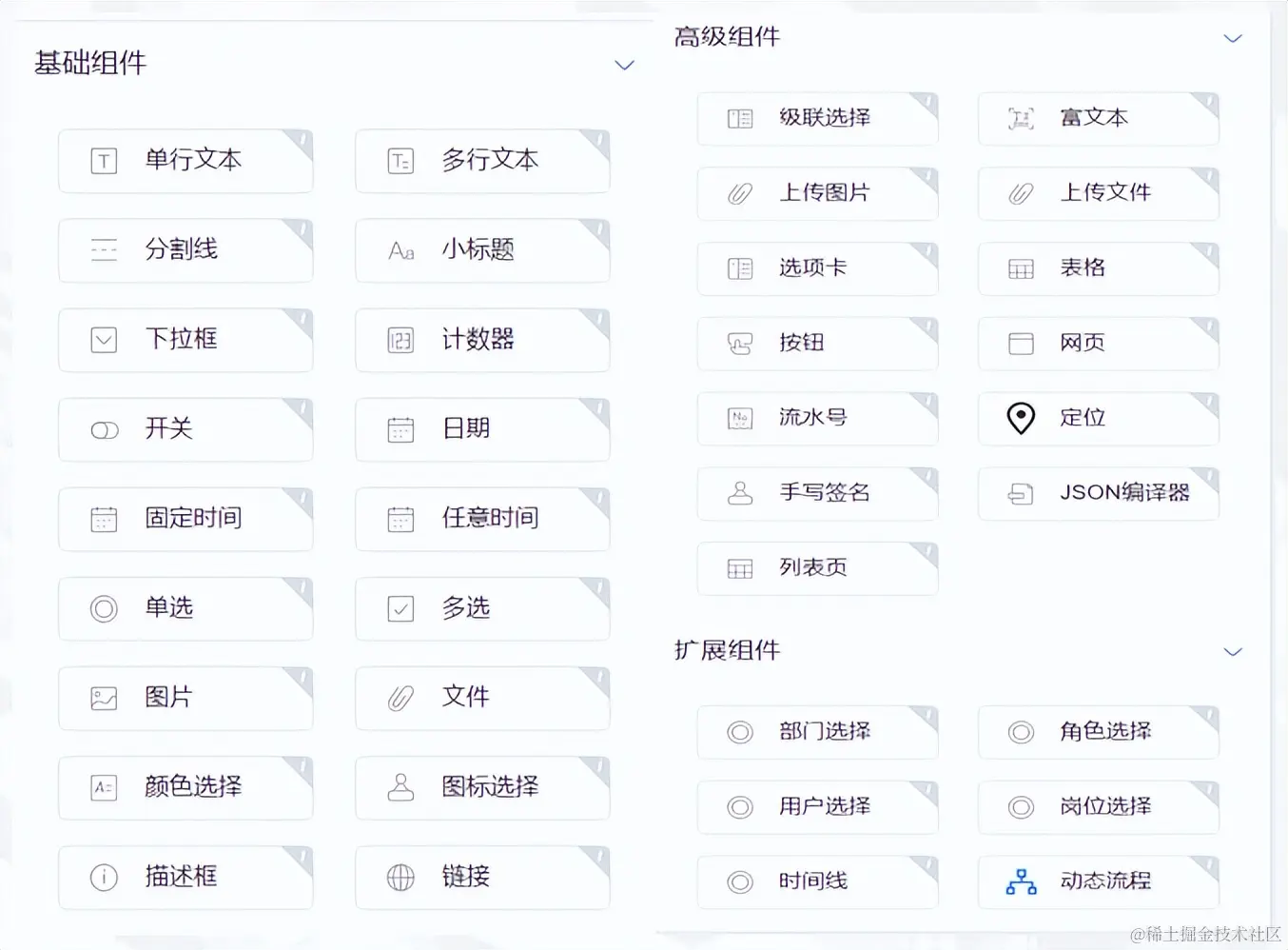 表单组件目前分为基础组件、高级组件与扩展组件