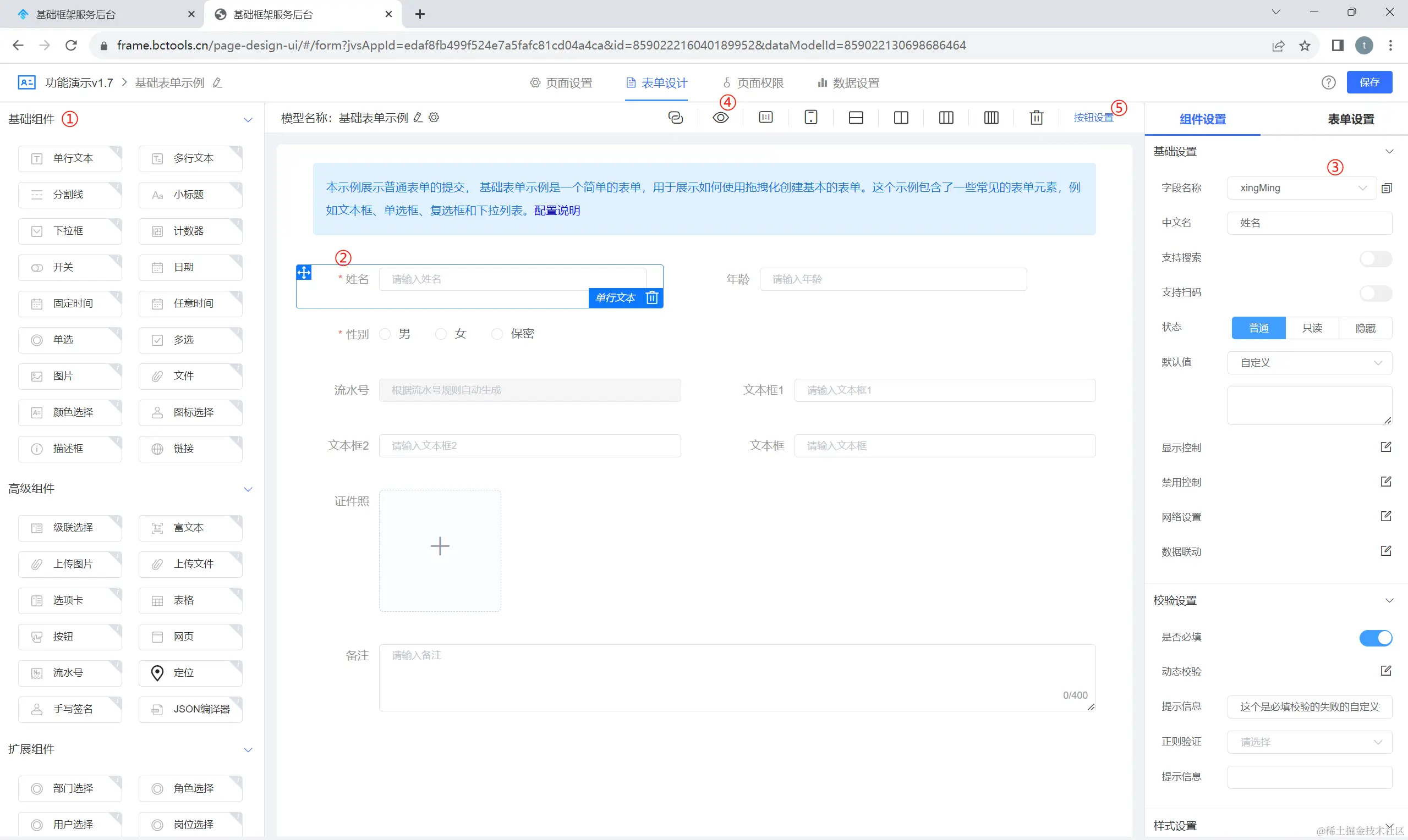 ①:配置组件的名称与组件绑定数据模型字段