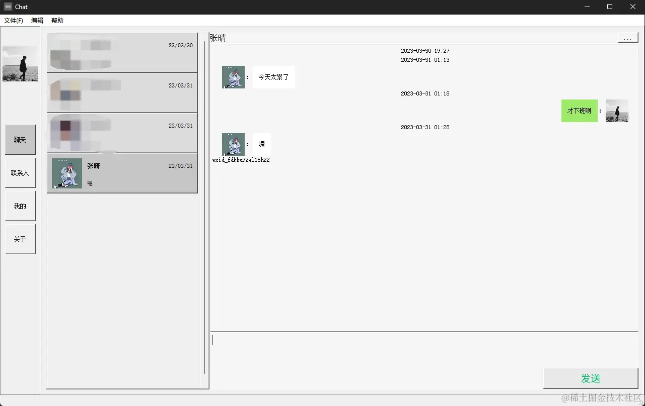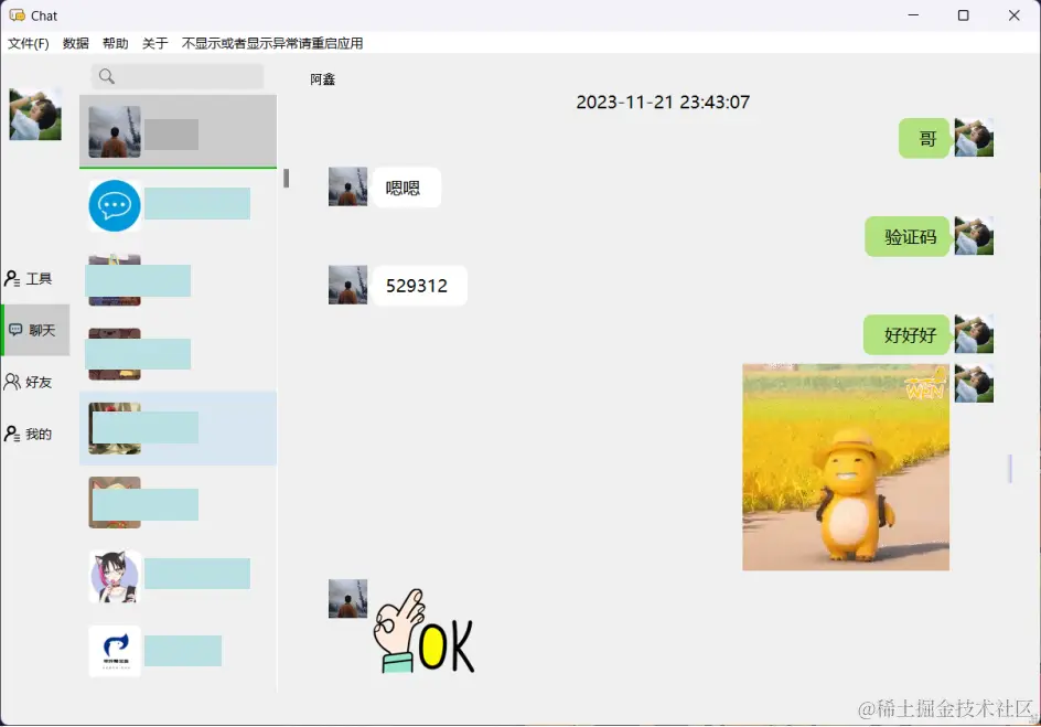 点击左侧导航栏——>聊天 ,会随机跳转到某一个好友的界面,滚轮滚动,可以向上翻看更早的聊天记录(温馨提示:可能在翻的时候会有卡顿的现象,是因为数据加载需要时间,后期我们会继续优化嗷~ )。目前聊天记录中文字、图片、表情包基本可以正常显示~