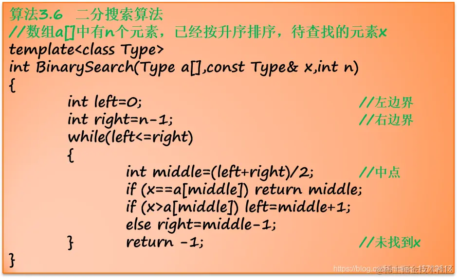 如果x<a[n/2],则我们只要在数组a的左半部分继续搜索x。