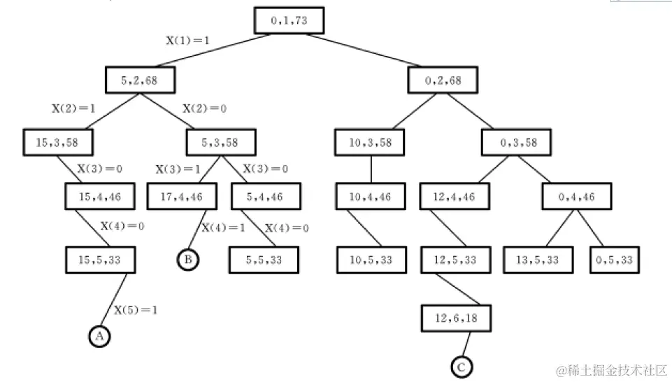 - 显式约束条件xi∈{0,1} ,1≤i≤n,如果没有选择Wi,则xi=0;如果选择了Wi,则xi=1。于是上面的解可以表示为(1,1,0,1)和(0,0,1,1);