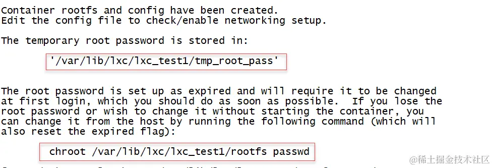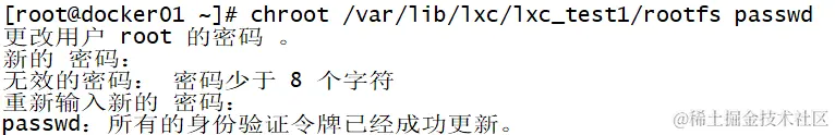 上面红色框框说明:root密码存放的位置在 /var/lib/lxc/lxc_test1/tmp_root_pass中,如果你想自己修改root密码可以使用chroot /var/lib/lxc/lxc_test1/rootfs passwd这个命令,这里我们自己修改一下密码为123456:
