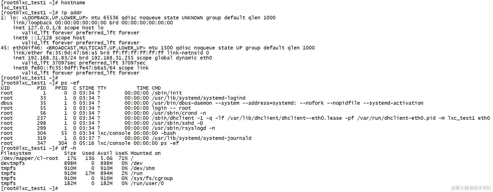 a、查看容器列表:可以看到lxc_test1容器的状态、IP等消息