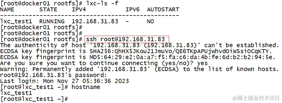 还可以使用ssh 用户名@容器IP方式登录容器:
