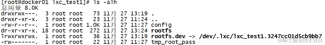 创建容器后,容器运行的根目录在 /var/lib/lxc/lxc_test1,查看该目录: