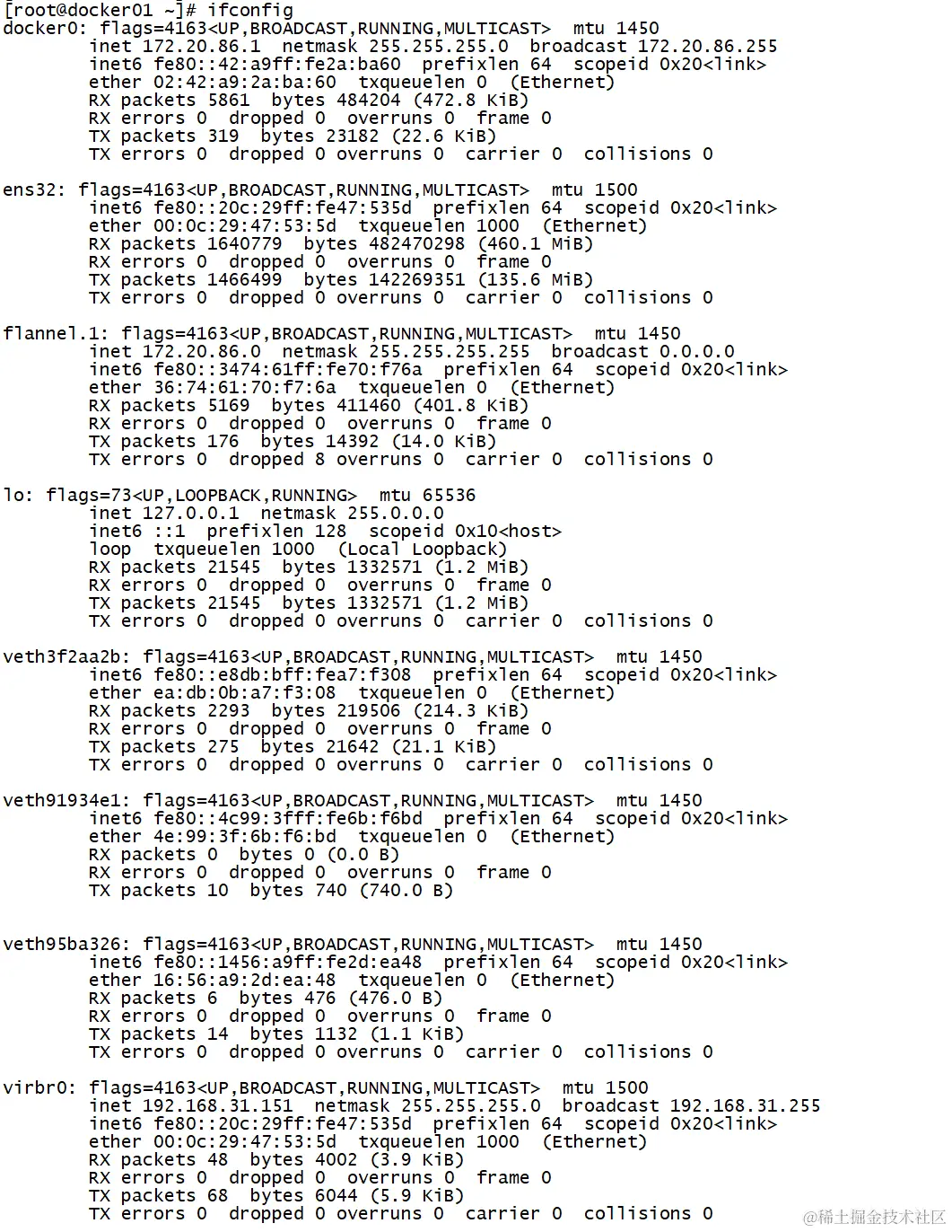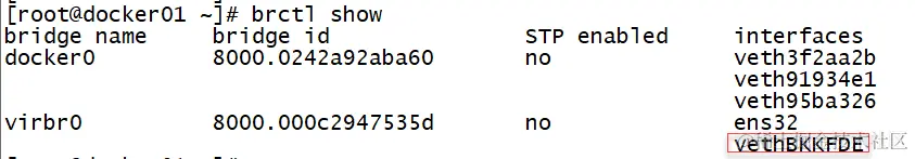 [root@docker01 ~]# brctl addif virbr0 ens32 ; # 将网桥关联到ens32这个网卡 \