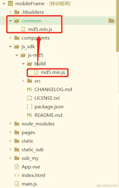 使用HbuilderX导入md5插件,把md5.min.js复制到common文件夹下,然后把js_sdk文件夹删除