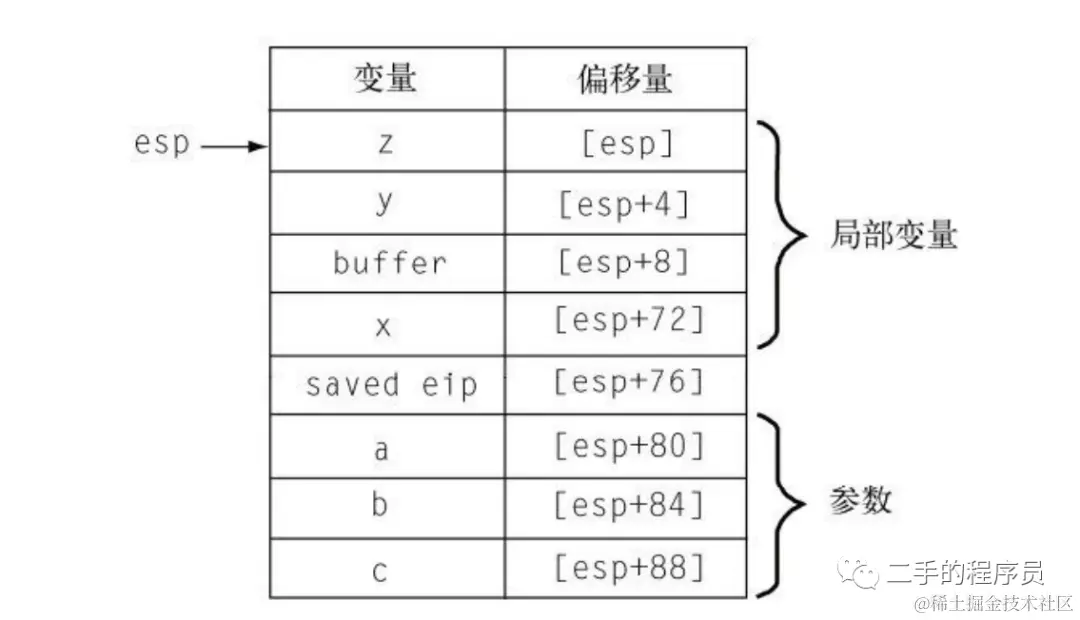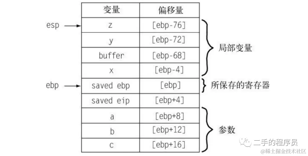 其中的“偏移量”栏显示的是引用栈帧中的任何局部变量或参数所需的基址+位移地址。