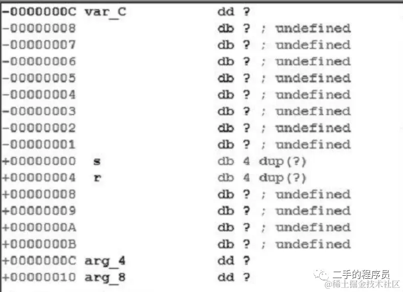 局部变量名称以var_ 为前缀,后面跟一个表示变量与被保存的帧指针之间距离(以字节为单位)的十六进制后缀。 在本例中,局部变量var_C 是一个4 字节(dword )变量,它位于所保存的帧指针之上,距离为12字节([ebp-0Ch] )。