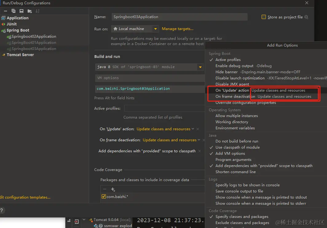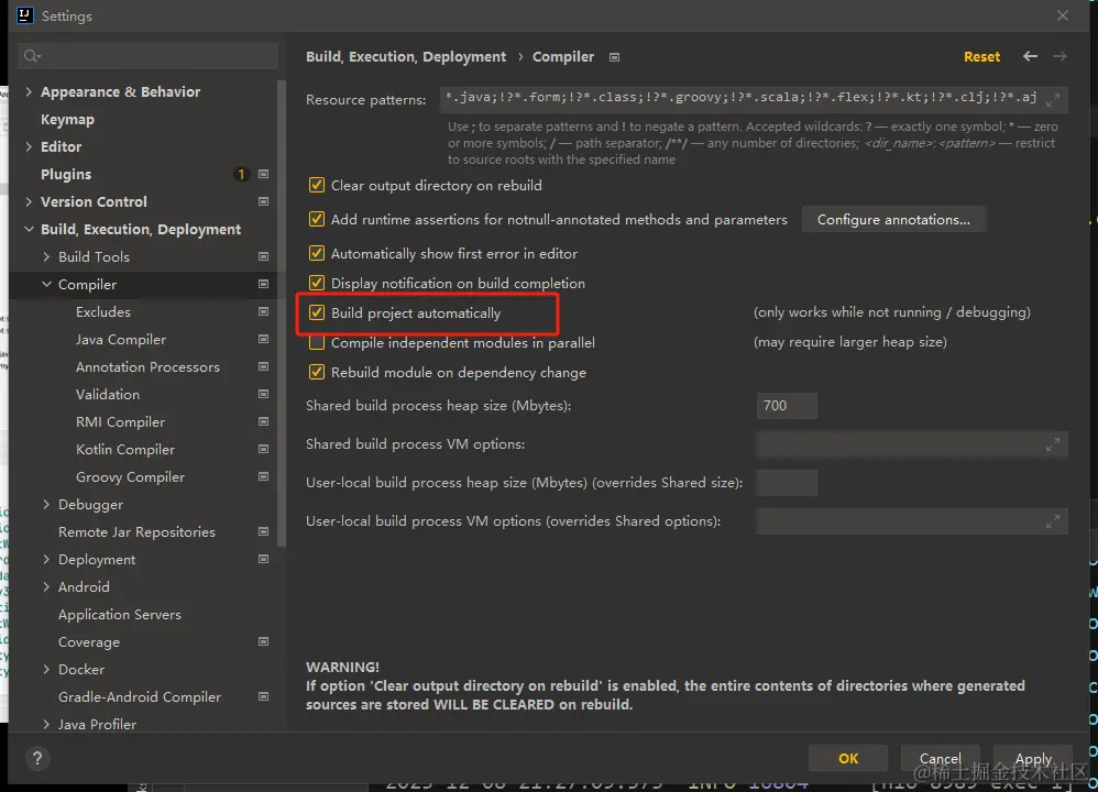 如果没有compiler.automake.allow.when.app.runing这个选项,那就进行服务器设置:按照下图将两个选项 设置成Update classes and resources