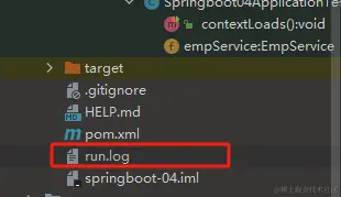 # 配置日志 logging: level: root: info # 调整根日志展示为debug com.baizhi.dao: debug # 输出指定包的日志级别。根日志保持默认即可 **file: name: run.log #指定生成日志文件名称 path: ./ #将日志文件生成当前目录(当前项目的目录中)**测试下,重新启动后,成功生成日志文件