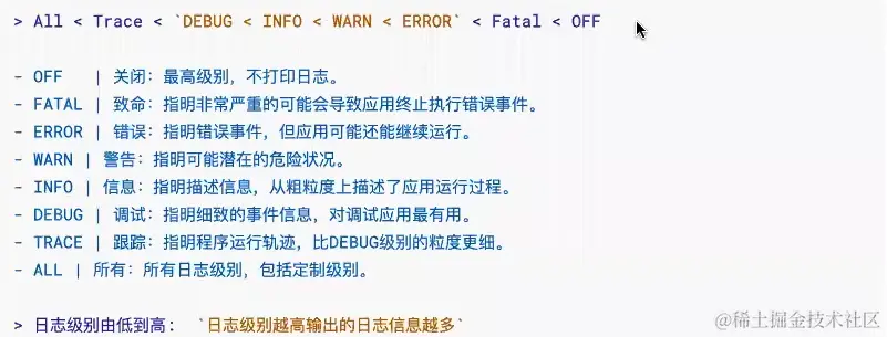 日常开发中,最常用的四个就是:DEBUG、INFO、WARN、ERROR