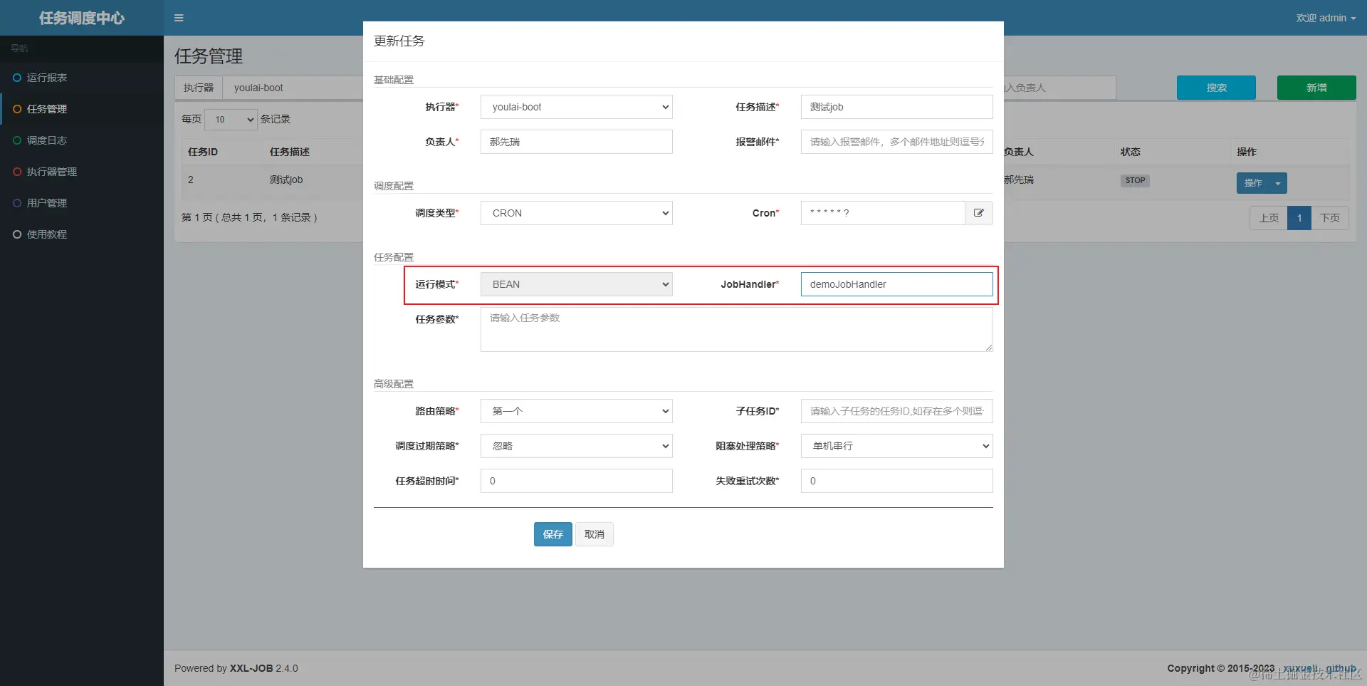 调度中心新增测试任务,运行模式为 BEAN , 任务处理器为 demoJobHandler