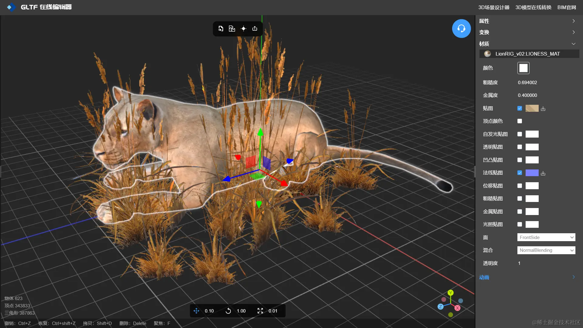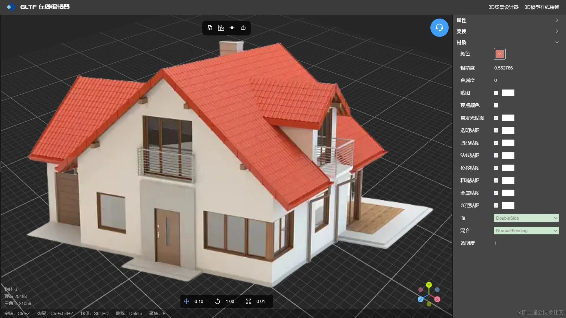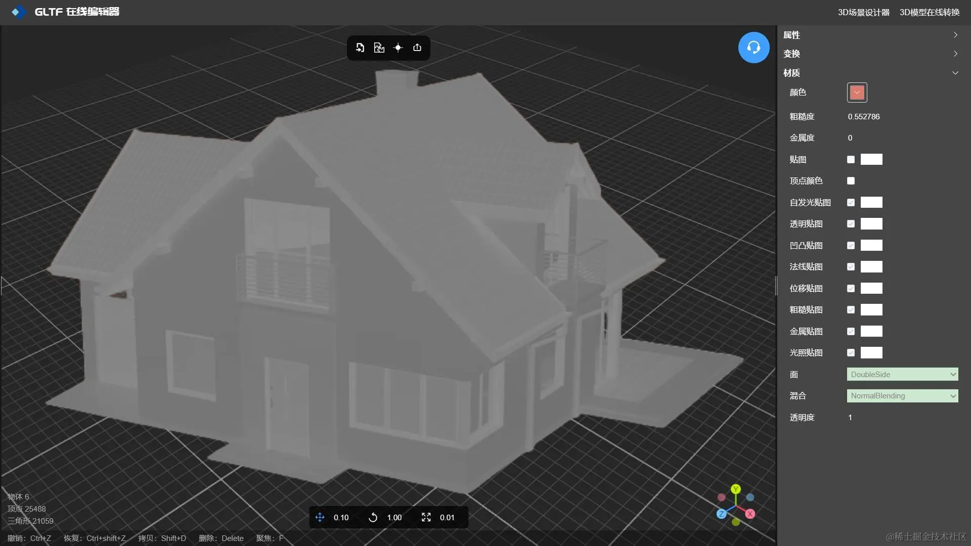 GLTF 编辑器 -NSDT 不仅可以设置3D模型纹理贴图,还可以设置模型的几何原点、以及对有相同材质属性的mesh进行合并,实现模型轻量化,同时支持对GLTF/GLB模型的在线查看、模型网格属性修改、模型编辑等功能,是一款不可多得的实用型在线模型编辑工具。