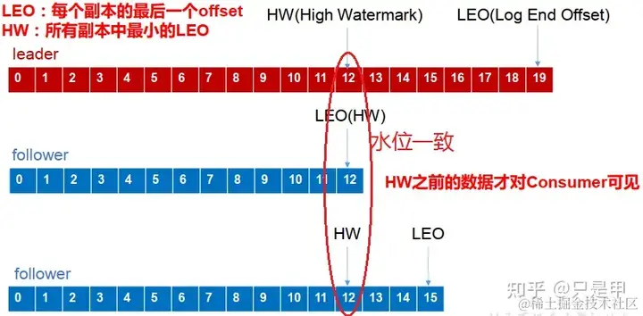 LEO(Log End Offset):每个副本最后的一个offset HW(High Watermark):高水位,指代消费者能见到的最大的offset,ISR队列中最小的LEO。