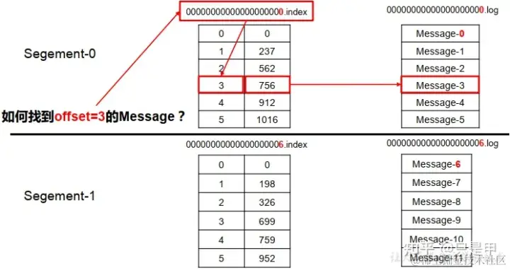 首先通过二分查找.index文件到查找到当前消息具体的偏移,如上图所示,查找为2,发现第二个文件为6,则定位到一个文件中。 然后通过第一个.index文件通过seek定位元素的位置3,定位到之后获取起始偏移量+当前文件大小=总的偏移量。 获取到总的偏移量之后,直接定位到.log文件即可快速获得当前消息大小。