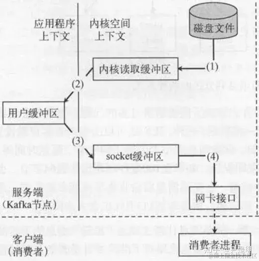 这是常规的读取操作: 1. 操作系统将数据从磁盘文件中读取到内核空间的页面缓存 2. 应用程序将数据从内核空间读入到用户空间缓冲区 3. 应用程序将读到的数据写回内核空间并放入到socket缓冲区 4. 操作系统将数据从socket缓冲区复制到网卡接口,此时数据通过网络发送给消费者