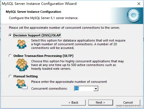 选择mysql允许的最大连接数,第一种是最大20个连接并发数,第二种是最大500个并发连接数,最后一种是自定义,你可以根据自己的需要选择