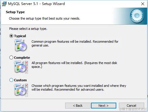 选择安装类型,有 “Typical(默认)”、“Complete(完全)”、“Custom(用户自定义)”三个选项,我们选择“Custom”,有更多的选项,也方便熟悉安装过程: