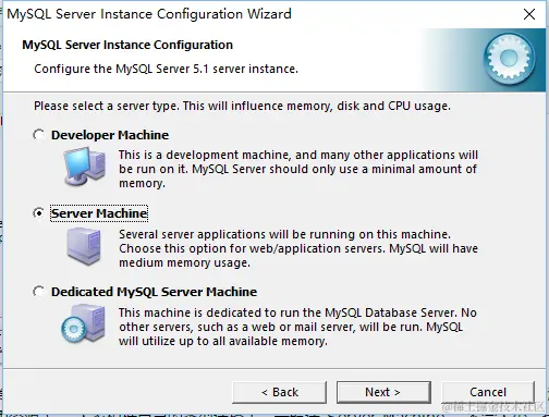 选择服务器类型,“Developer Machine(开发测试类,mysql占用很少资源)”、“Server Machine(服务器类型,mysql占用较多资源)”、“DedicatedMySQL Server Machine(专门的数据库服务器,mysql占用所有可用资源)”,大家根据自己的类型选择了,一般选“Server Machine”,不会太少,也不会占满。