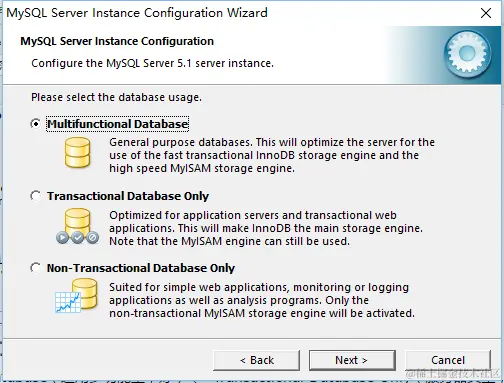 选择mysql数据库的大致用途,“Multifunctional Database(通用多功能型,好)”、“Transactional Database Only(服务器类型,专注于事务处理,一般)”、“Non-Transactional Database Only(非事务处理型,较简单,主要做一些监控、记数用,对MyISAM数据类型的支持仅限于non-transactional),随自己的用途而选 择了,我这里选择“Multifunctional Database”,按“Next”继续。