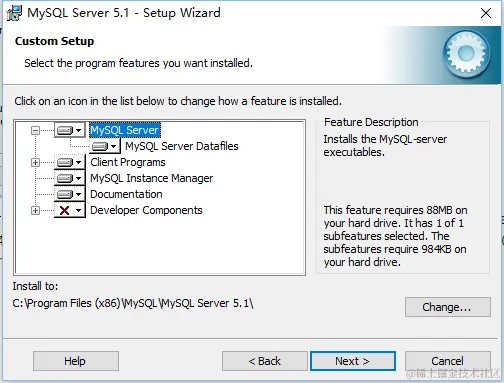 从上到下的意思依次是:“MySQL Server(mysql服务器)”、“Client Programs(mysql客户端程序)”、“Documentation(文档)”,这些默认都是安装的。最后一项是“Developer Components(开发者部分)”,如果需要的话左键单击,选择“This feature, and all subfeatures, will be installed on local hard drive.”,即“此部分,及下属子部分内容,全部安装在本地硬盘上”。点选“Change...”,手动指定安装目录。