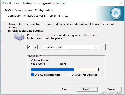 对InnoDB Tablespace进行配置,就是数据存放位置,如果修改了,要记住位置,重装的时候要选择一样的地方,否则可能会造成数据库损坏.一般为默认位置。