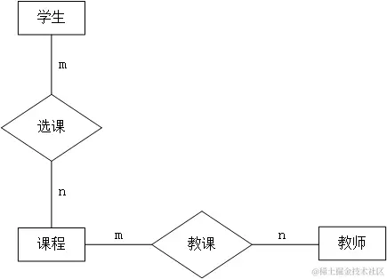 下面以学生选课系统为例进行说明。学生选课系统的实体包括:学生、教师、课程;其联系一般为学生与课程之间是一种多对多的关系,教师与课程之间是多对多的关系。学生可以同时选择多门课程,一门课程也可以同时被多个学生同时选择;一位教师可以教授多门课程,一门可能可以由多个教师教授。因此他们之间的联系如下: