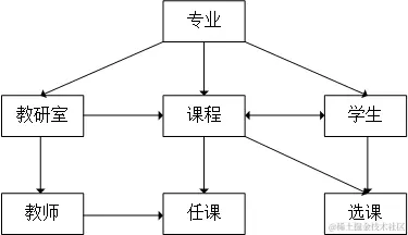 由上图中可以看出课程(实体)的父节点由专业、教研室、学生。以课程和学生之间的关系来说,他们是一种m:n的关系,也就是说一个学生能够选修多门课程,一门课程也可以被多个学生同时选修。