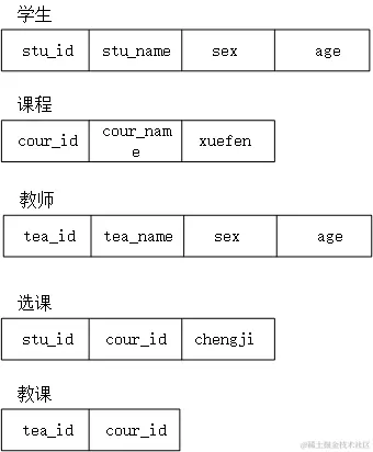 2. 关系型数据库可用于表示实体之间的多对多的关系,只是此时要借助第三个关系---表,来实现多对多的关系,如下例子中的学生选课系统中学生和课程之间表现出一种多对多的关系,那么需要借助第三个表,也就是选课表将二者联系起来;