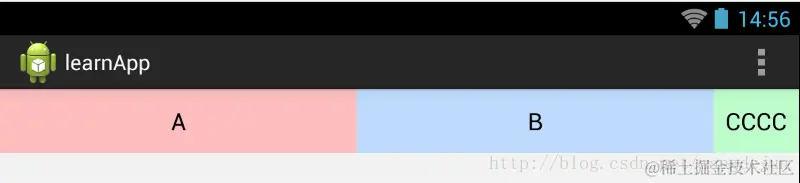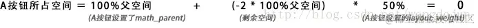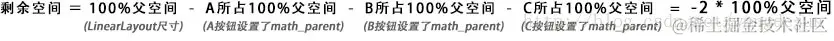 首先,布局需要计算“剩余空间”,因为ABC三个按钮控件都设置了math_parent的宽度,所以“剩余空间”变成了: