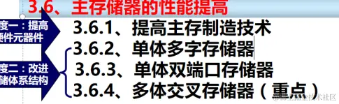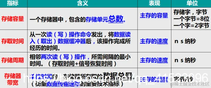 主存储器的性能指标:存储容量、存取时间、存储周期、存储器带宽。