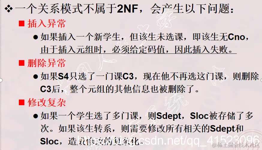 (2)更新异常(Update Anomalies) (数据冗余 ,更新数据时,维护数据完整性代价大。)