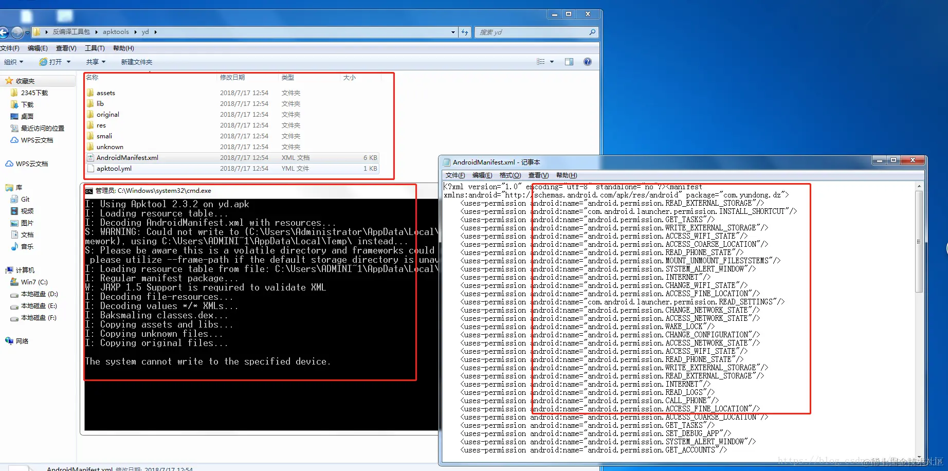 1.apktool:由于直接改apk后缀进行解压的话打开的xml文件会乱码,所以我们使用apktool工具查看apk的xml文件、AndroidManifest.xml和图片等
